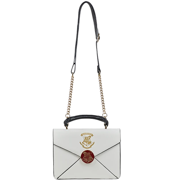 Secure your very own place at Hogwarts with this Acceptance Letter bag. The cream-coloured bag is in an envelope design and features the Hogwarts school crest in a metallic gold print. The bag is complete with fully adjustable straps and a padded black handle which are perfect for a comfortable fit.