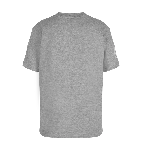 A grey kids t-shirt featuring Dobby and the Platform 9 3/4 logo on the arm.