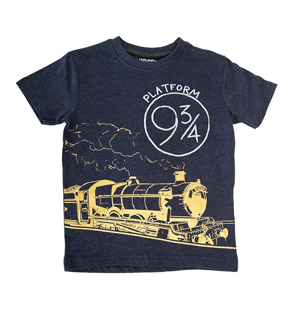 This amazing dark grey kids Hogwarts Express t-shirt will have budding students excited for their first trip to Hogwarts! Featuring a large graphic of the Hogwarts Express leaving Platform 9 ¾ at Kings Cross station, the famous steam engine can be seen in a yellow gold print. A Platform 9 ¾ circular logo takes up a large part of the top left hand side of the chest in a whimsical white font.