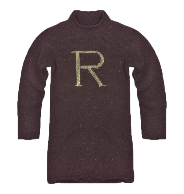This youth ‘R’ jumper is a replica of the jumper knitted by Mrs. Weasley for Ron in the Harry Potter film series. Using a specially made wool-silk yarn, this jumper is knitted and assembled in the Scottish Mill that made the costumes for the cast and extras in the Harry Potter film series. Available in youth sizes.