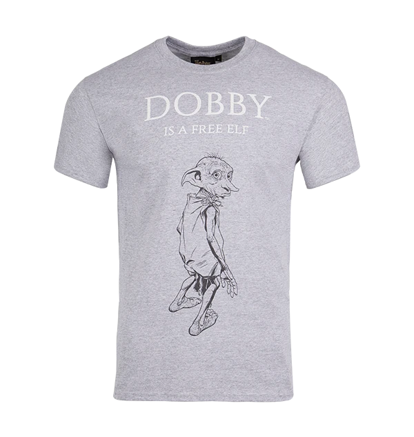 Add this stylish unisex Dobby t-shirt to your wardrobe. The light grey t-shirt features a bespoke design of Dobby the House Elf in grey and is complete with the slogan ‘Dobby is a free elf’ printed in the centre at the top of the t-shirt.