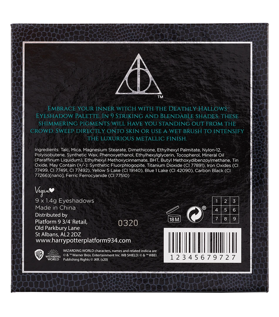 Embrace your inner witch with the Deathly Hallows Eyeshadow Palette. Available in nine striking and blendable shades, these high-colour pigments will have you standing out from the crowd with their bold colour finish. Sweep directly onto eyelids or use a wet brush to intensify the luxurious metallic colours. Create infinite eye looks taking you from daytime to nighttime with the metallic and matte textured shadows. The eyeshadow palette is complete with a glossy black and grey snakeskin packaging and includes a mirror on the inside of the palette. Deathly Hallows Eyeshadow Palette is vegan and cruelty-free. Keep away from heat.