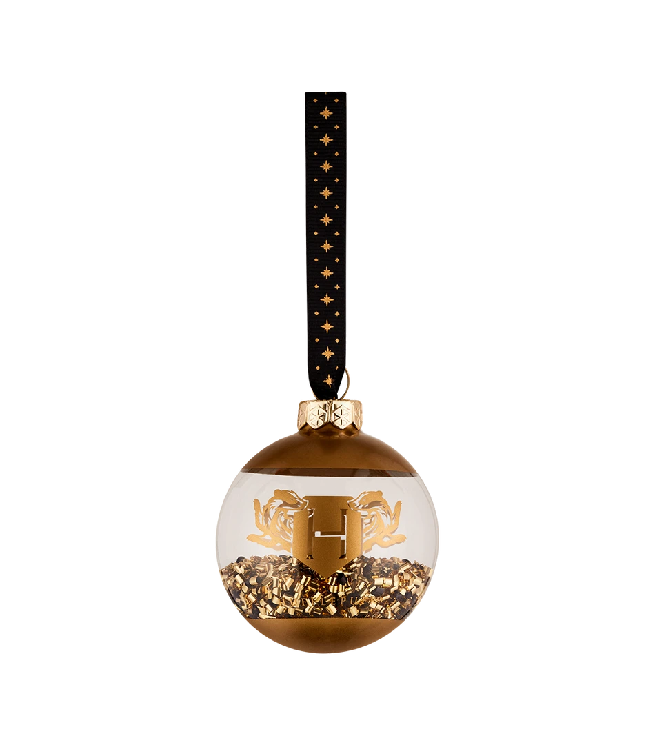 Add some sparkle to your Christmas this year with this Hufflepuff Bead Bauble. The bauble features black and gold beads in a circular glass casing and is complete with a metallic gold badger, the historic symbol of the Hufflepuff House. The letter ‘H’ is centralised in the middle of the bauble representing the Hufflepuff house. The crown and the base of the bauble has been designed with a shiny gold finish and the hanging ribbon features a black design with gold stars.