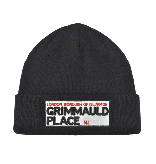This black beanie features a Grimmauld Place street sign patch on the front, with stitched lettering detail.
