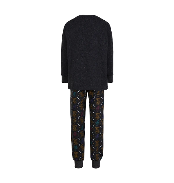 A grey long-sleeve top with a metallic-gold Hogwarts crest pairs with cosy dark grey bottoms featuring an all-over printed pattern. An elasticated waistband is included for ultimate snugness.
