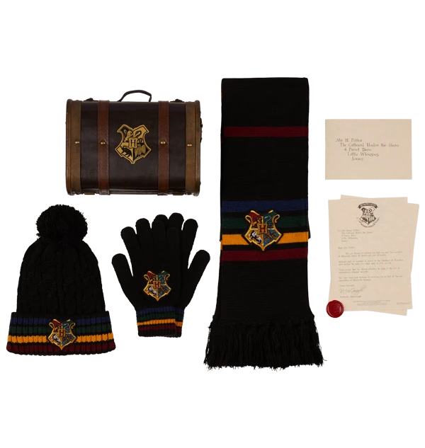 Take home this mini version of the Hogwarts School Trunk, crafted to resemble those used by Hogwarts students travelling on the Hogwarts Express. This bespoke Hogwarts gift trunk features some exclusive items from our knitwear collection, as well as a Hogwarts Acceptance Letter, personalised with your own name and complete with an exclusive supplies list.