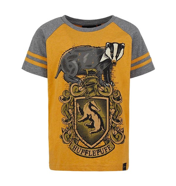 This brand new Kids Hufflepuff T-Shirt features the Hufflepuff crest in traditional bright yellow house colours. The cosy t-shirt is made from 100% cotton and is complete with two yellow stripes on each sleeve and a unique badger design, the historic symbol of the Hufflepuff house. The word Seeker features on the reverse with its Quidditch position number in a light grey font.