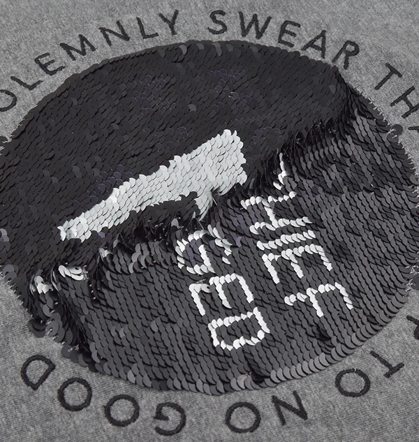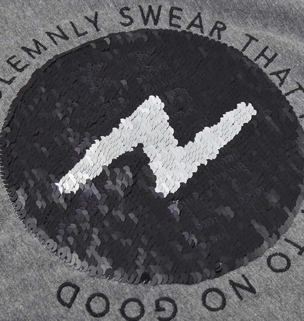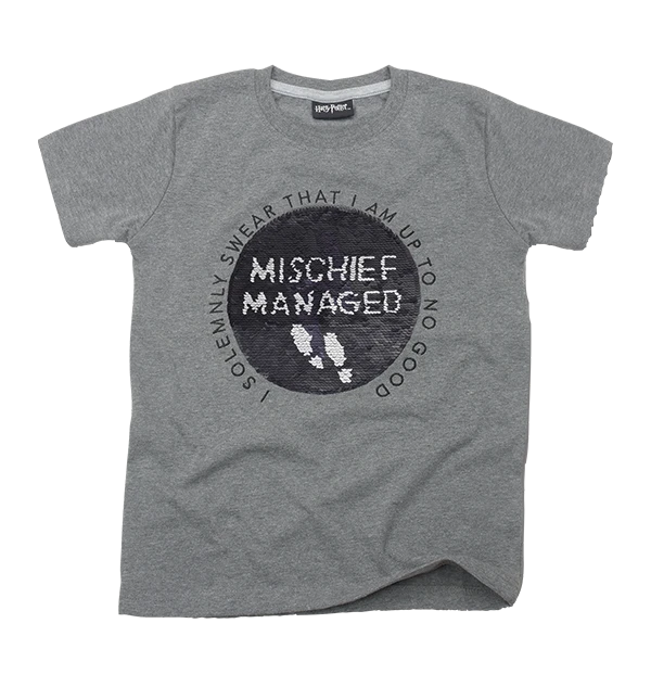 A grey kids t-shirt featuring a black and silver sequin Mischief Managed logo on the front – until you brush the sequins upward to reveal a lightning bolt image hidden underneath! Circular embroidered text reads ‘I solemnly swear that I am up to no good’. 100% cotton. Machine washable.