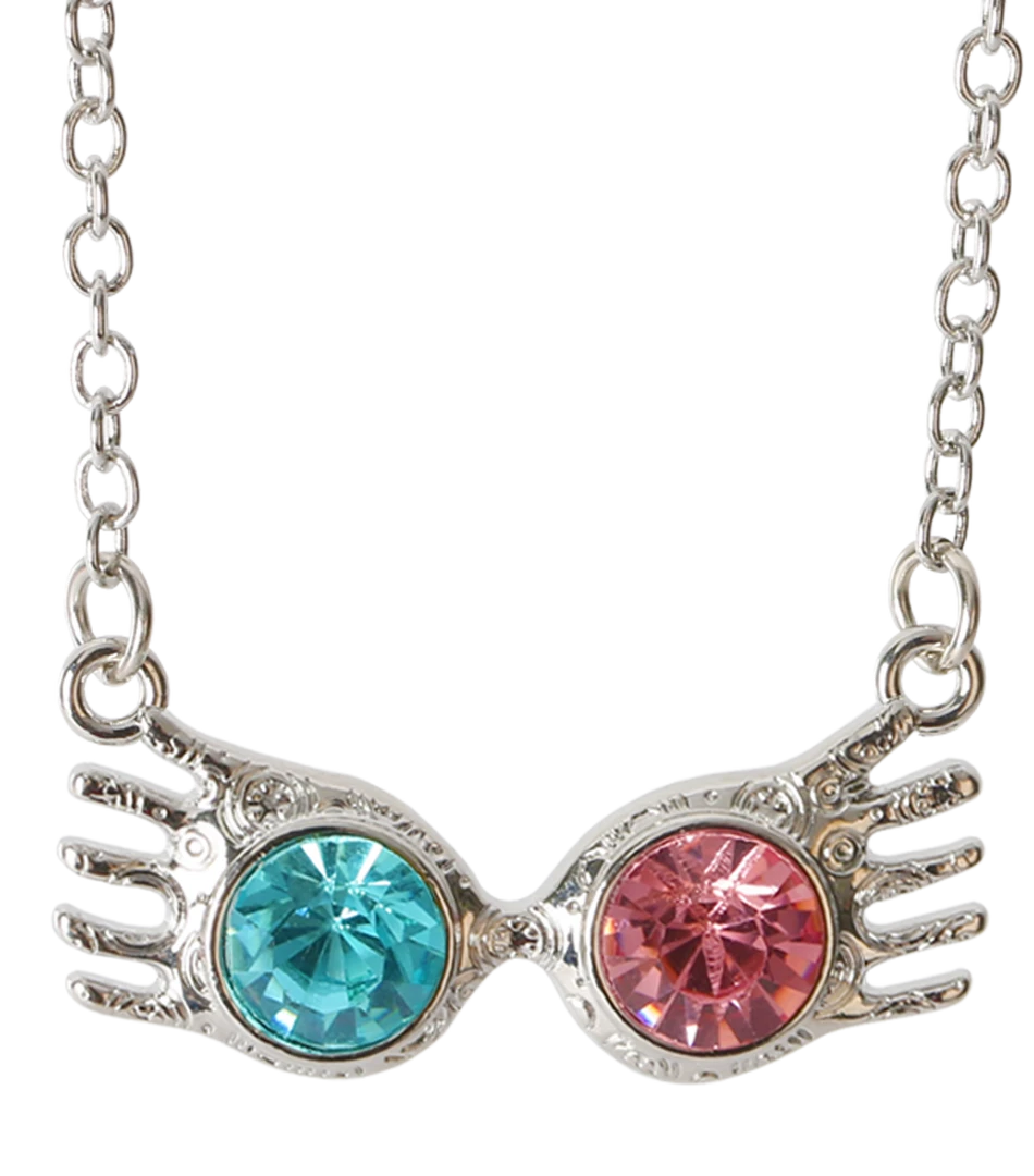 Luna Lovegood was first seen wearing a pair of Spectrespecs Luna Lovegood on the train ride to Hogwarts in 1996. According to Luna, when wearing the glasses, they made wrackspurts (invisible creatures that floated through one’s ears causing their brain to go fuzzy) visible to the wizarding eye. The necklace is complete with a small, silver-plated charm on the hook including the Platform 9 ¾ logo.