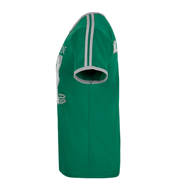 Celebrate your Hogwarts house loyalty with this bespoke Slytherin House Seeker T-Shirt. The short-sleeved t-shirt comes in the traditional house colour green which is combined with grey stripes along each sleeve. The number 07 is printed in a grey and white design in the centre of the t-shirt alongside the word Slytherin which is printed across the chest in grey. This personalised Slytherin t-shirt is complete with an embroidered grey serpent, the iconic Slytherin house animal.