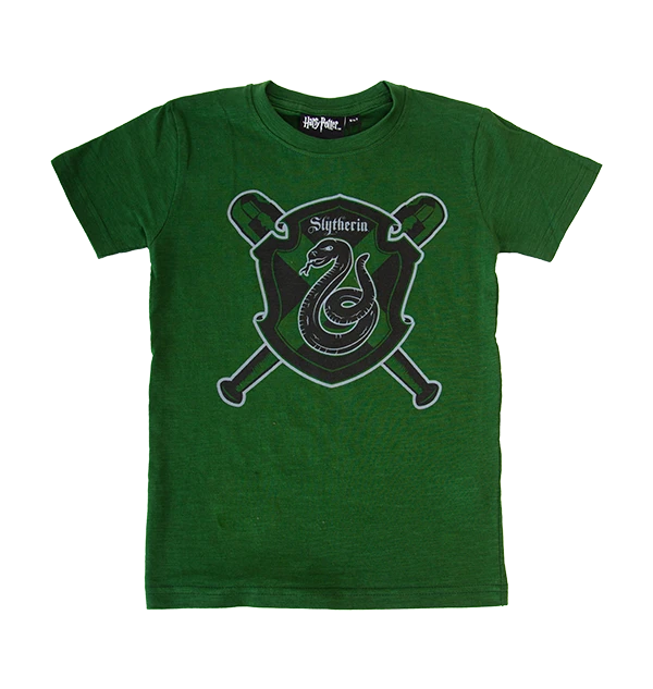The stylish emerald green short sleeve shirt features a prominent snake mascot on a Quidditch shield, placed on top of a pair of crossed beater’s bats. The house name ‘Slytherin’ can be seen in white font at the top of the shield crest.